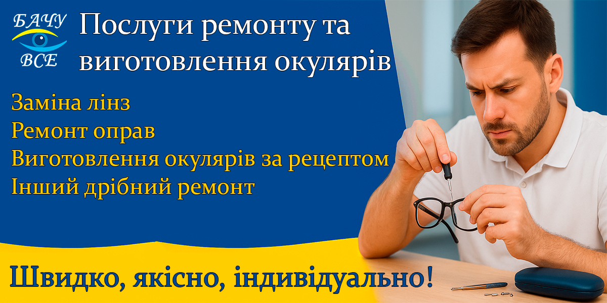 Проводимо діагностику зору на сучасному обладнанні, виконуємо підбір окулярів і контактних лінз, заміна лінз у вашій оправі та ремонт (рихтування, полірування, дрібні відновлення) — швидко й акуратно 🔧.